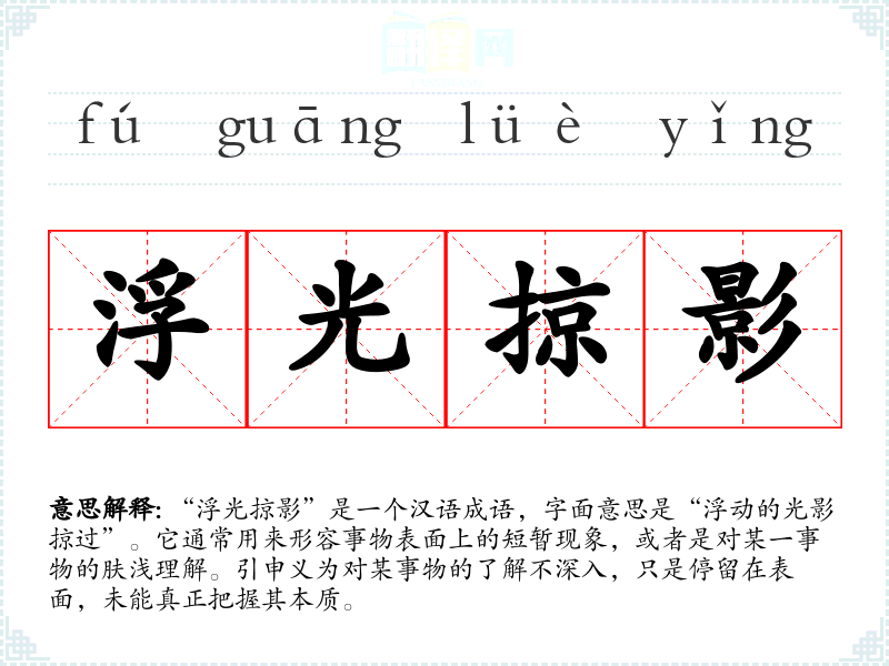 “浮光掠影”是一个汉语成语,字面意思是“浮动的光影掠过”。它通常用来形容事物表面上的短暂现象,或者是对某一事物的肤浅理解。引申义为对某事物的了解不深入,只是停留在表面,未能真正把握其本质。