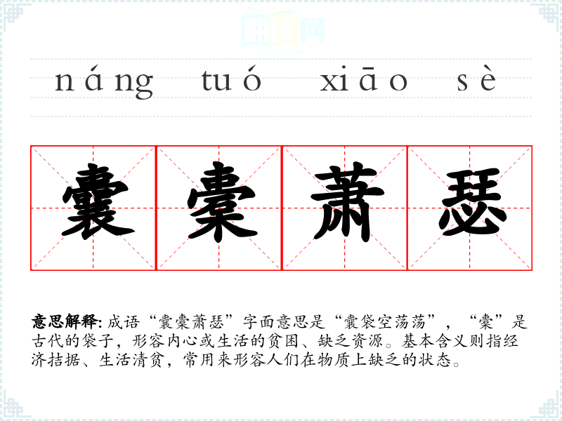 成语“囊橐萧瑟”字面意思是“囊袋空荡荡”,“橐”是古代的袋子,形容内心或生活的贫困、缺乏资源。基本含义则指经济拮据、生活清贫,常用来形容人们在物质上缺乏的状态。
