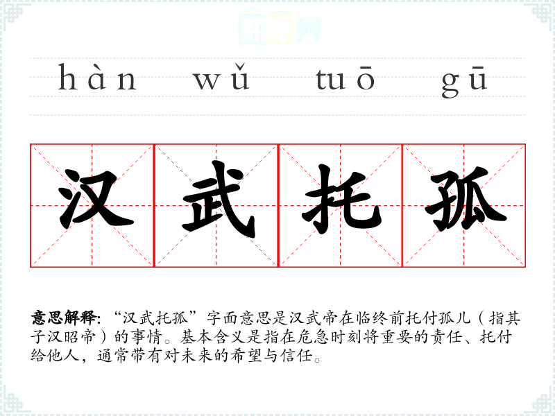 “汉武托孤”字面意思是汉武帝在临终前托付孤儿(指其子汉昭帝)的事情。基本含义是指在危急时刻将重要的责任、托付给他人,通常带有对未来的希望与信任。