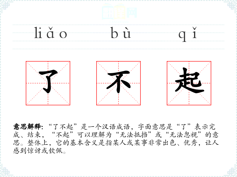 “了不起”是一个汉语成语,字面意思是“了”表示完成、结束,“不起”可以理解为“无法抵挡”或“无法忽视”的意思。整体上,它的基本含义是指某人或某事非常出色、优秀,让人感到惊讶或钦佩。