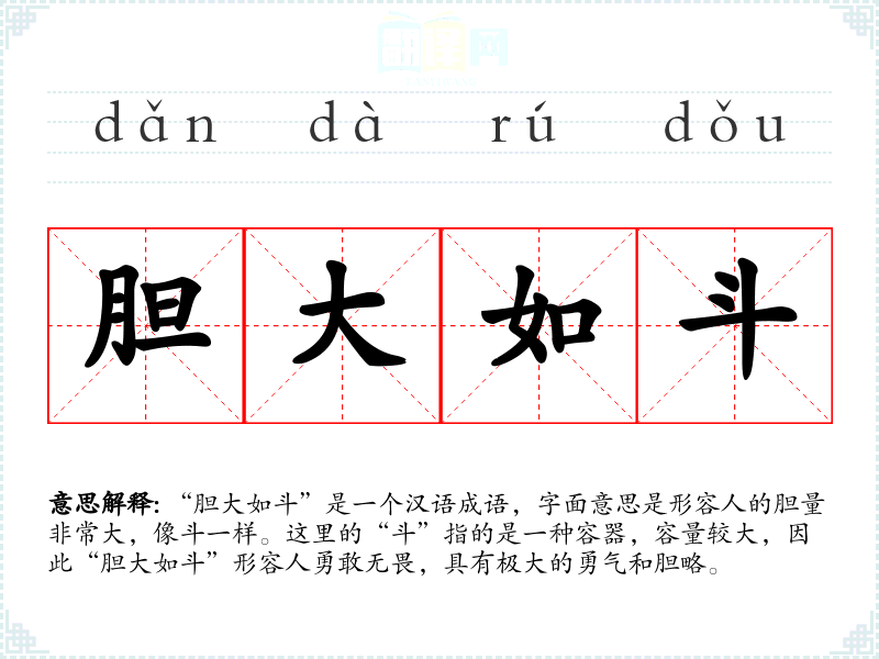 该成语的来源并不十分明确,但可以追溯到古代文学和民间口语中。通常认为,成语中的“胆”代表着勇气和决断力,而“斗”则象征着容量和力量。其背后反映了古人对勇气的赞美和对胆量的崇高追求。
