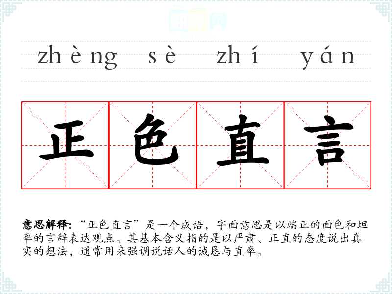 “正色直言”是一个成语,字面意思是以端正的面色和坦率的言辞表达观点。其基本含义指的是以严肃、正直的态度说出真实的想法,通常用来强调说话人的诚恳与直率。