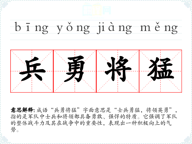 - 同义成语:如“将勇兵强”,同样表达了军队的勇猛和强大。