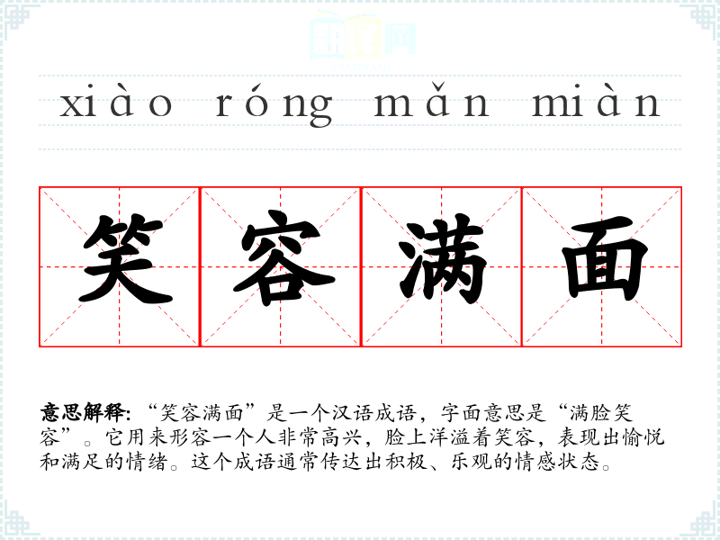 “笑容满面”是一个汉语成语,字面意思是“满脸笑容”。它用来形容一个人非常高兴,脸上洋溢着笑容,表现出愉悦和满足的情绪。这个成语通常传达出积极、乐观的情感状态。