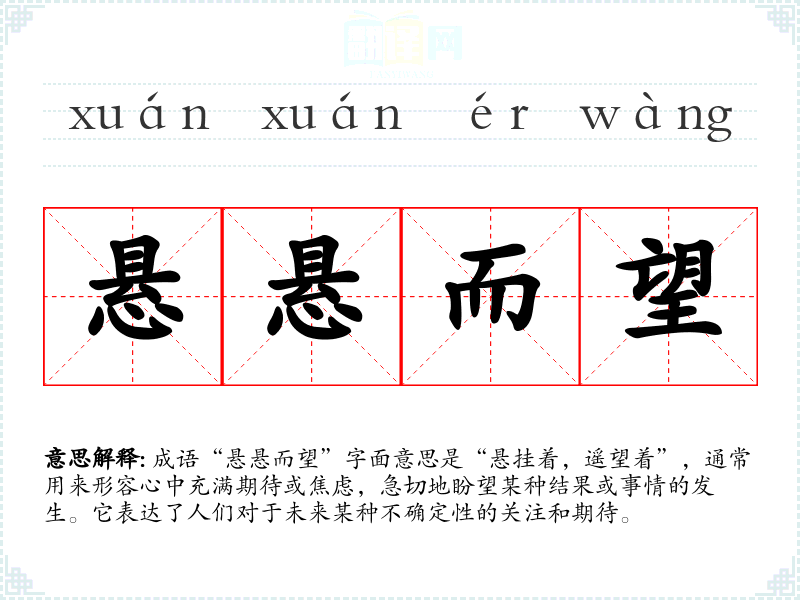 成语“悬悬而望”字面意思是“悬挂着,遥望着”,通常用来形容心中充满期待或焦虑,急切地盼望某种结果或事情的发生。它表达了人们对于未来某种不确定性的关注和期待。