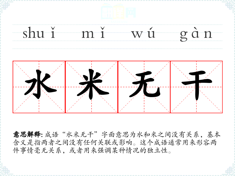 成语“水米无干”字面意思为水和米之间没有关系,基本含义是指两者之间没有任何关联或影响。这个成语通常用来形容两件事情毫无关系,或者用来强调某种情况的独立性。