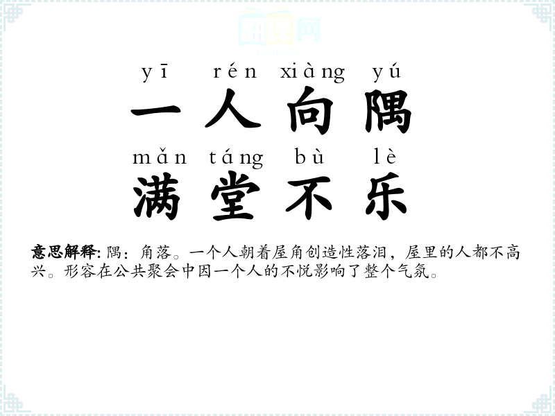 隅:角落。一个人朝着屋角创造性落泪,屋里的人都不高兴。形容在公共聚会中因一个人的不悦影响了整个气氛。 |