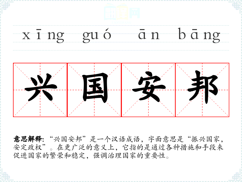 “兴国安邦”是一个汉语成语,字面意思是“振兴国家,安定政权”。在更广泛的意义上,它指的是通过各种措施和手段来促进国家的繁荣和稳定,强调治理国家的重要性。
