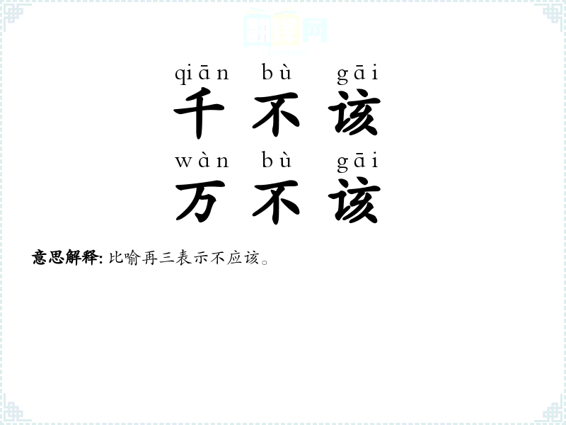 | 千不该,万不该 | 比喻再三表示不应该。 |