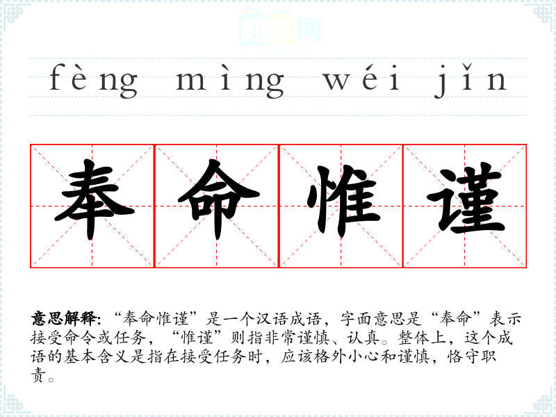“奉命惟谨”是一个汉语成语,字面意思是“奉命”表示接受命令或任务,“惟谨”则指非常谨慎、认真。整体上,这个成语的基本含义是指在接受任务时,应该格外小心和谨慎,恪守职责。