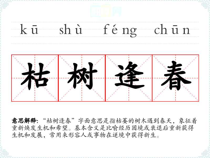“枯树逢春”字面意思是指枯萎的树木遇到春天,象征着重新焕发生机和希望。基本含义是比喻经历困境或衰退后重新获得生机和发展,常用来形容人或事物在逆境中获得新生。