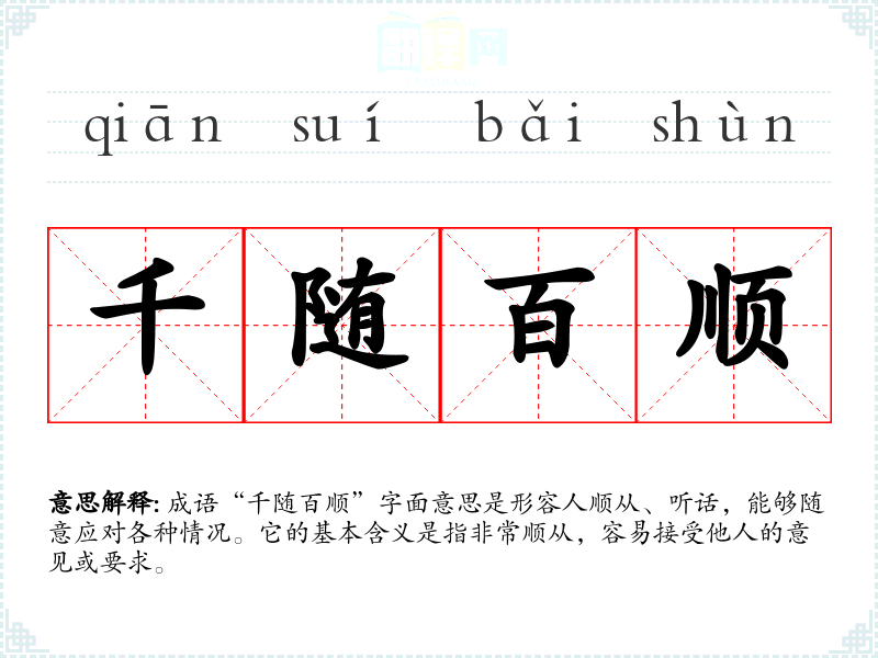 成语“千随百顺”字面意思是形容人顺从、听话,能够随意应对各种情况。它的基本含义是指非常顺从,容易接受他人的意见或要求。