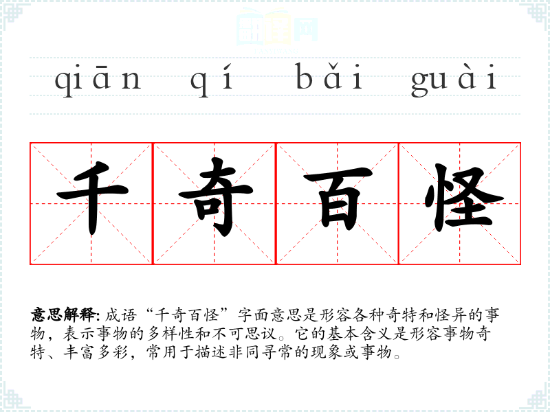 成语“千奇百怪”字面意思是形容各种奇特和怪异的事物,表示事物的多样性和不可思议。它的基本含义是形容事物奇特、丰富多彩,常用于描述非同寻常的现象或事物。