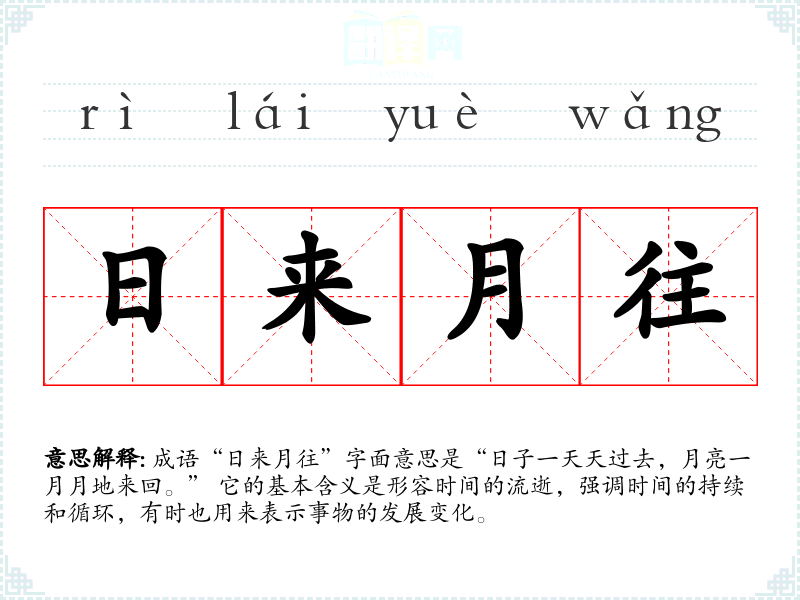 成语“日来月往”字面意思是“日子一天天过去,月亮一月月地来回。” 它的基本含义是形容时间的流逝,强调时间的持续和循环,有时也用来表示事物的发展变化。