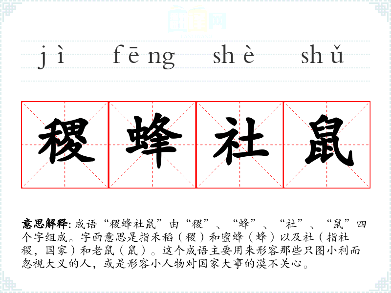 成语“稷蜂社鼠”由“稷”、“蜂”、“社”、“鼠”四个字组成。字面意思是指禾稻(稷)和蜜蜂(蜂)以及社(指社稷,国家)和老鼠(鼠)。这个成语主要用来形容那些只图小利而忽视大义的人,或是形容小人物对国家大事的漠不关心。