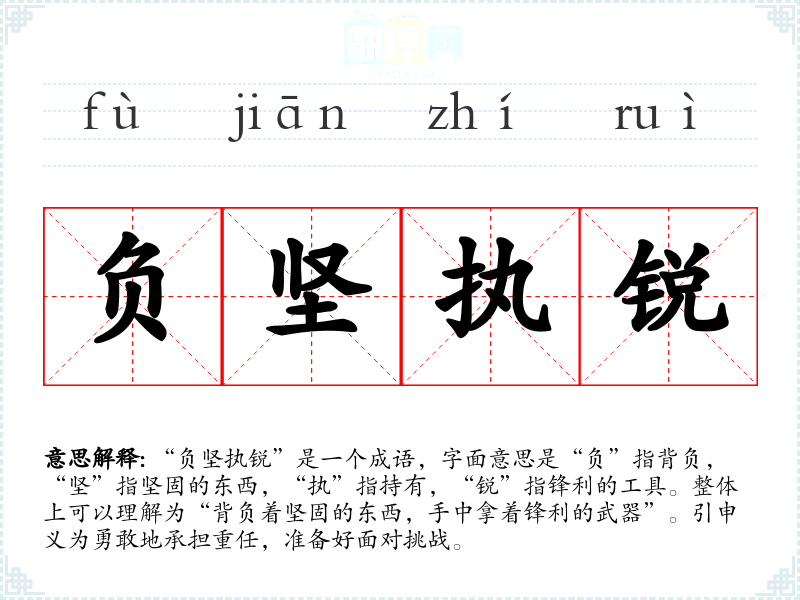 “负坚执锐”是一个成语,字面意思是“负”指背负,“坚”指坚固的东西,“执”指持有,“锐”指锋利的工具。整体上可以理解为“背负着坚固的东西,手中拿着锋利的武器”。引申义为勇敢地承担重任,准备好面对挑战。