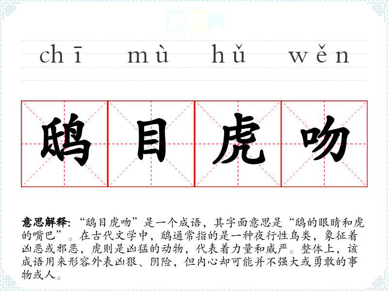 “鸱目虎吻”的具体来源不详,但其构成涉及的动物象征在**古代文化中常常用来描绘性格特征。鸱与虎的结合,反映了古代文人对动物特性与人性之间关系的思考与比喻。相关的文献可以追溯到《庄子》和《山海经》中对动物特性的描绘。