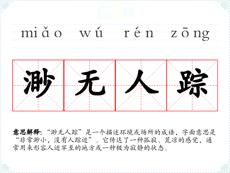 “渺无人踪”是一个描述环境或场所的成语,字面意思是“非常渺小,没有人踪迹”。它传达了一种孤寂、荒凉的感觉,通常用来形容人迹罕至的地方或一种极为寂静的状态。