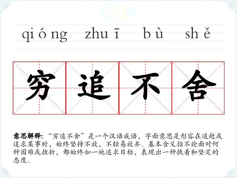 “穷追不舍”是一个汉语成语,字面意思是形容在追赶或追求某事时,始终坚持不放,不轻易放弃。基本含义指不论面对何种困难或挫折,都始终如一地追求目标,表现出一种执着和坚定的态度。