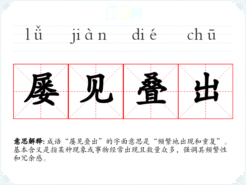 成语“屡见叠出”的字面意思是“频繁地出现和重复”。基本含义是指某种现象或事物经常出现且数量众多,强调其频繁性和冗余感。