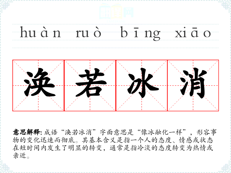 成语“涣若冰消”字面意思是“像冰融化一样”,形容事物的变化迅速而彻底。其基本含义是指一个人的态度、情感或状态在短时间内发生了明显的转变,通常是指冷淡的态度转变为热情或亲近。