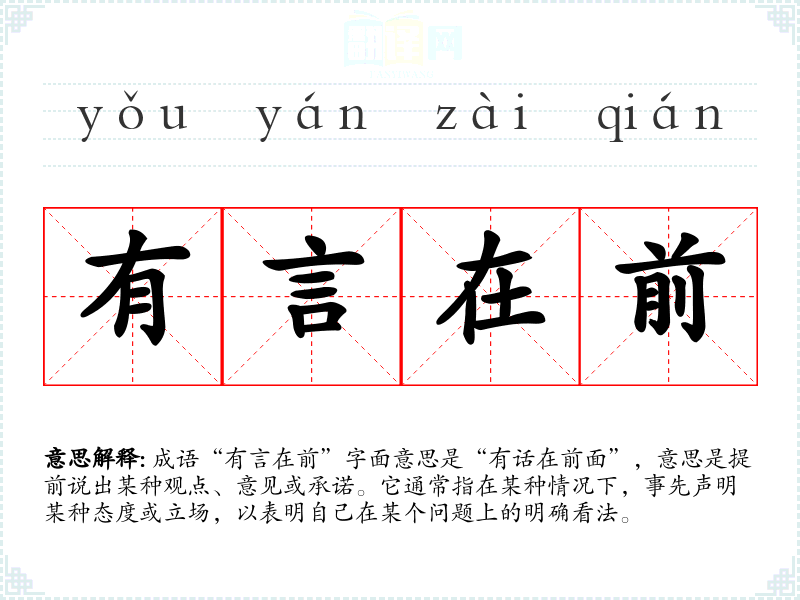 成语“有言在前”字面意思是“有话在前面”,意思是提前说出某种观点、意见或承诺。它通常指在某种情况下,事先声明某种态度或立场,以表明自己在某个问题上的明确看法。