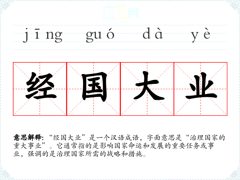 “经国大业”是一个汉语成语,字面意思是“治理国家的重大事业”。它通常指的是影响国家命运和发展的重要任务或事业,强调的是治理国家所需的战略和措施。