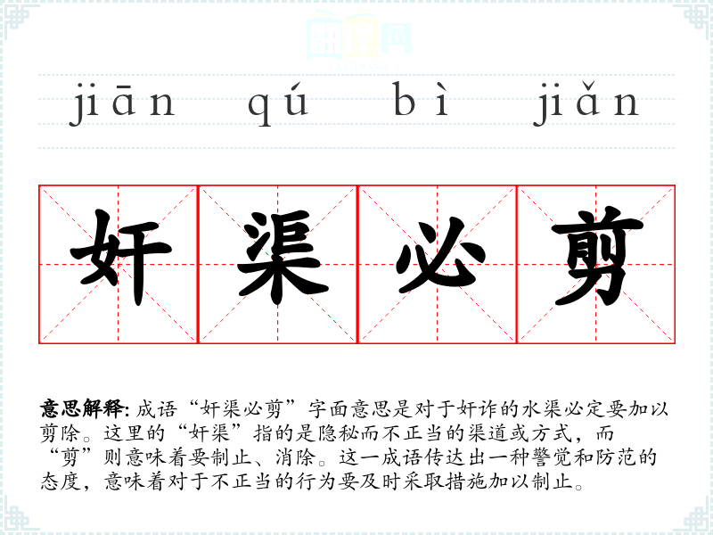 成语“奸渠必剪”字面意思是对于奸诈的水渠必定要加以剪除。这里的“奸渠”指的是隐秘而不正当的渠道或方式,而“剪”则意味着要制止、消除。这一成语传达出一种警觉和防范的态度,意味着对于不正当的行为要及时采取措施加以制止。
