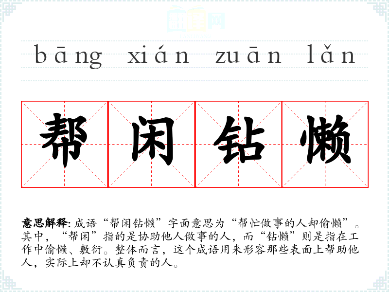 成语“帮闲钻懒”字面意思为“帮忙做事的人却偷懒”。其中,“帮闲”指的是协助他人做事的人,而“钻懒”则是指在工作中偷懒、敷衍。整体而言,这个成语用来形容那些表面上帮助他人,实际上却不认真负责的人。