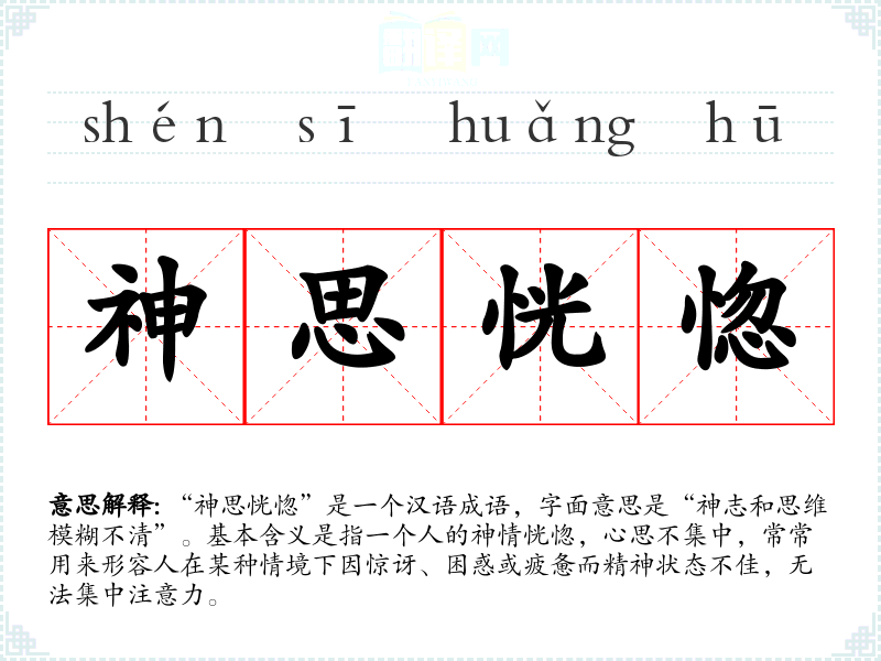 “神思恍惚”是一个汉语成语,字面意思是“神志和思维模糊不清”。基本含义是指一个人的神情恍惚,心思不集中,常常用来形容人在某种情境下因惊讶、困惑或疲惫而精神状态不佳,无法集中注意力。