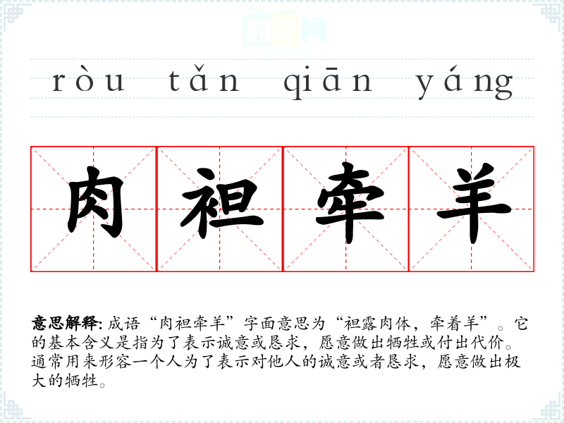 成语“肉袒牵羊”字面意思为“袒露肉体,牵着羊”。它的基本含义是指为了表示诚意或恳求,愿意做出牺牲或付出代价。通常用来形容一个人为了表示对他人的诚意或者恳求,愿意做出极大的牺牲。