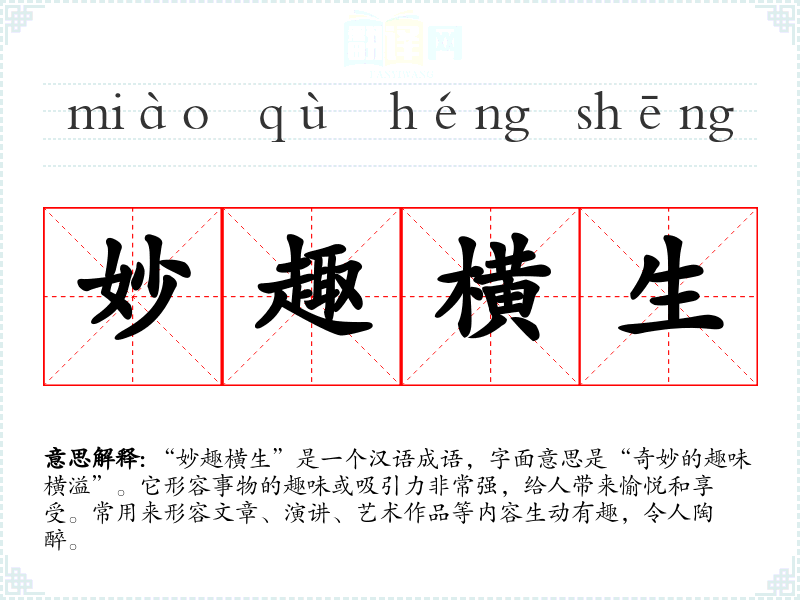 “妙趣横生”是一个汉语成语,字面意思是“奇妙的趣味横溢”。它形容事物的趣味或吸引力非常强,给人带来愉悦和享受。常用来形容文章、演讲、艺术作品等内容生动有趣,令人陶醉。