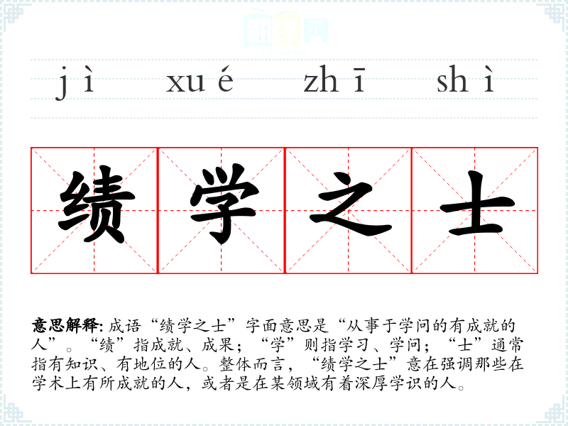在英语中,类似的表达可以是“scholar”或者“academic”,不过它们没有“绩”这个成就的强调。不同文化中对学者的尊重程度和定义也可能有所不同。