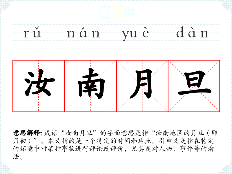 成语“汝南月旦”的字面意思是指“汝南地区的月旦(即月初)”,本义指的是一个特定的时间和地点。引申义是指在特定的环境中对某种事物进行评论或评价,尤其是对人物、**等的看法。