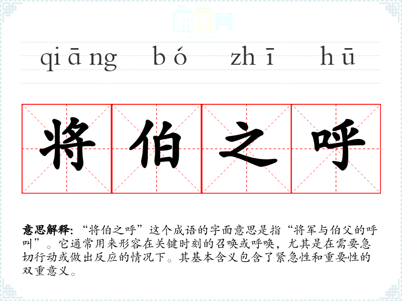 “将伯之呼”这个成语的字面意思是指“将军与伯父的呼叫”。它通常用来形容在关键时刻的召唤或呼唤,尤其是在需要急切行动或做出反应的情况下。其基本含义包含了紧急性和重要性的双重意义。