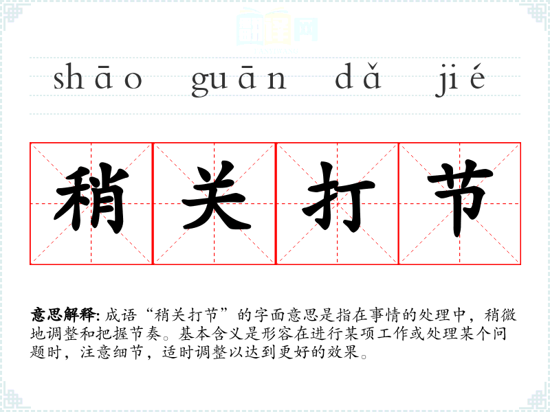 成语“稍关打节”的字面意思是指在事情的处理中,稍微地调整和把握节奏。基本含义是形容在进行某项工作或处理某个问题时,注意细节,适时调整以达到更好的效果。