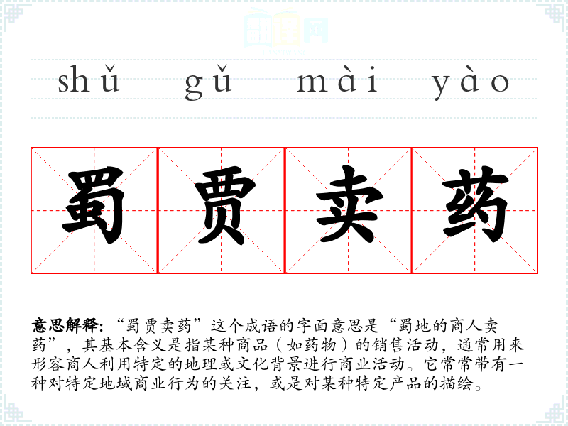 “蜀贾卖药”这个成语的字面意思是“蜀地的商人卖药”,其基本含义是指某种商品(如药物)的销售活动,通常用来形容商人利用特定的地理或文化背景进行商业活动。它常常带有一种对特定地域商业行为的关注,或是对某种特定产品的描绘。