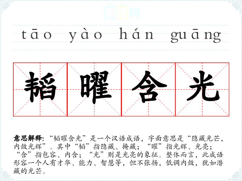 “韬曜含光”是一个汉语成语,字面意思是“隐藏光芒,内敛光辉”。其中“韬”指隐藏、掩藏;“曜”指光辉、光亮;“含”指包容、内含;“光”则是光亮的象征。整体而言,此成语形容一个人有才华、能力、智慧等,但不张扬,低调内敛,犹如潜藏的光芒。
