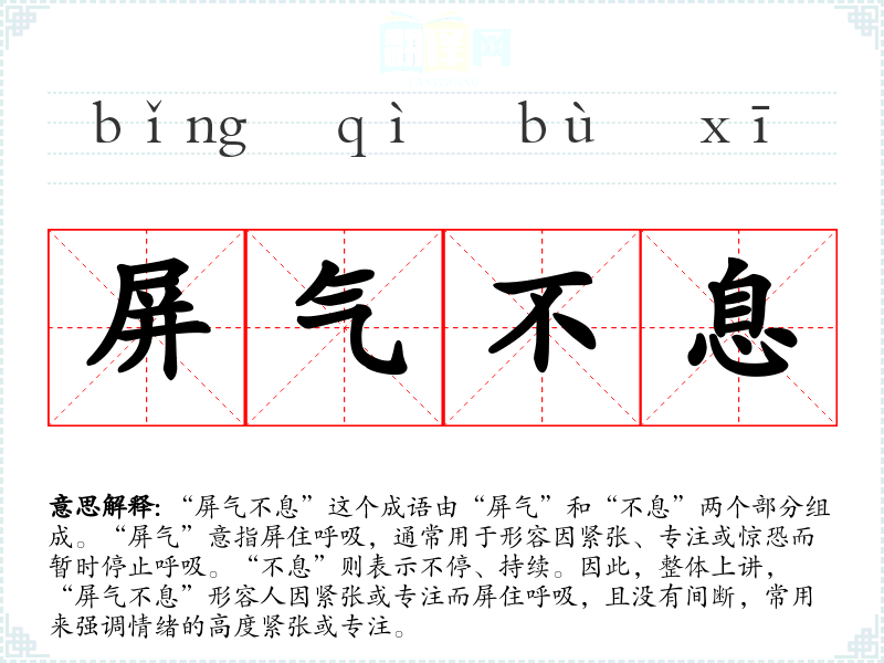 “屏气不息”这个成语由“屏气”和“不息”两个部分组成。“屏气”意指屏住呼吸,通常用于形容因紧张、专注或惊恐而暂时停止呼吸。“不息”则表示不停、持续。因此,整体上讲,“屏气不息”形容人因紧张或专注而屏住呼吸,且没有间断,常用来强调情绪的高度紧张或专注。