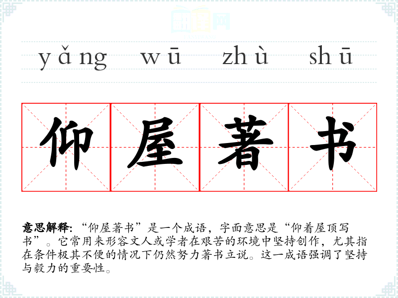 “仰屋著书”是一个成语,字面意思是“仰着屋顶写书”。它常用来形容文人或学者在艰苦的环境中坚持创作,尤其指在条件极其不便的情况下仍然努力著书立说。这一成语强调了坚持与毅力的重要性。