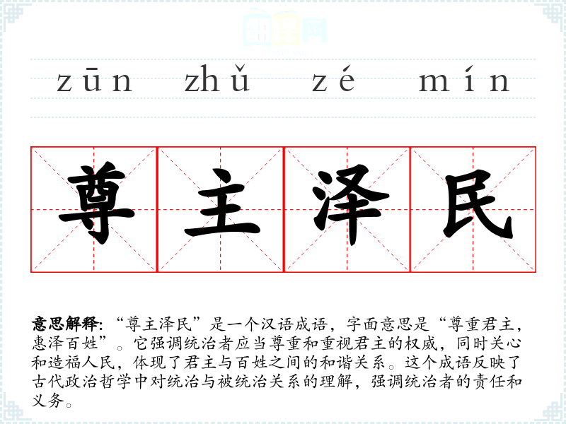 在**传统文化中,君主与百姓之间的关系一直是政治哲学讨论的重要主题。“尊主泽民”反映了对君主责任的期待,以及对民众福祉的重视。在现代社会,这一成语依然适用,尤其是在强调政府责任、社会公平和民生问题的背景下,具有重要的现实意义。