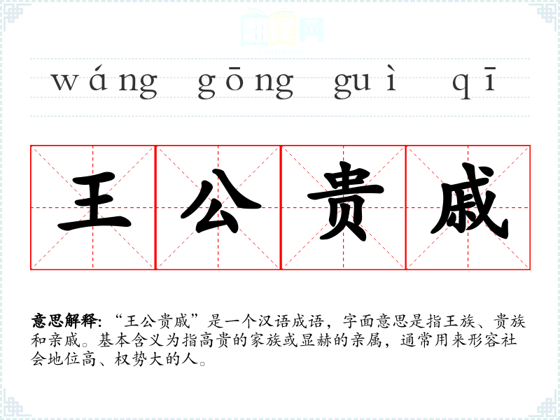 “王公贵戚”是一个汉语成语,字面意思是指王族、贵族和亲戚。基本含义为指高贵的家族或显赫的亲属,通常用来形容社会地位高、权势大的人。