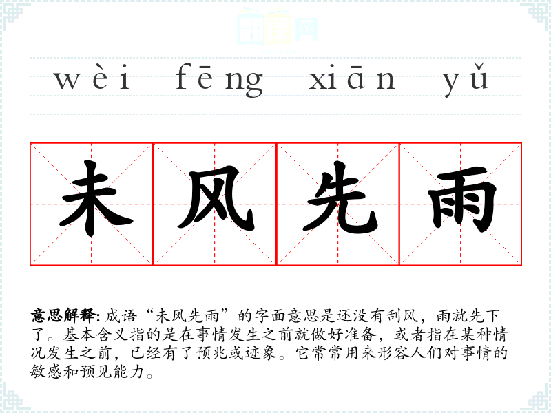 成语“未风先雨”的字面意思是还没有刮风,雨就先下了。基本含义指的是在事情发生之前就做好准备,或者指在某种情况发生之前,已经有了预兆或迹象。它常常用来形容人们对事情的敏感和预见能力。