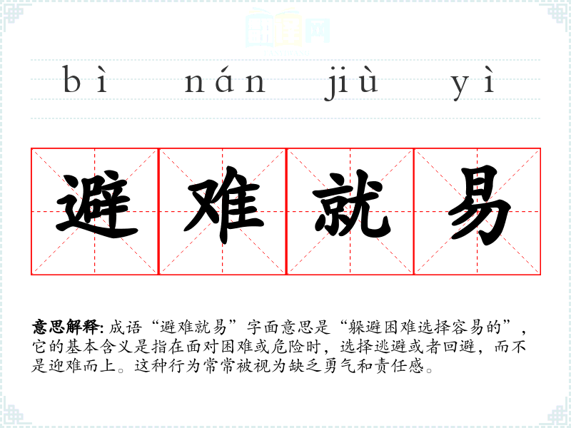 成语“避难就易”字面意思是“躲避困难选择容易的”,它的基本含义是指在面对困难或危险时,选择逃避或者回避,而不是迎难而上。这种行为常常被视为缺乏勇气和责任感。