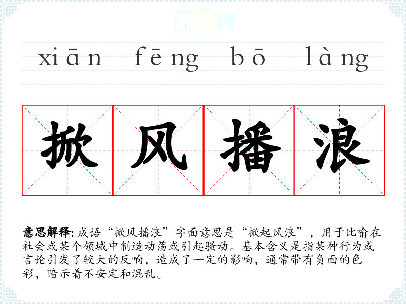 成语“掀风播浪”字面意思是“掀起风浪”,用于比喻在社会或某个领域中制造动荡或引起骚动。基本含义是指某种行为或言论引发了较大的反响,造成了一定的影响,通常带有负面的色彩,暗示着不安定和混乱。