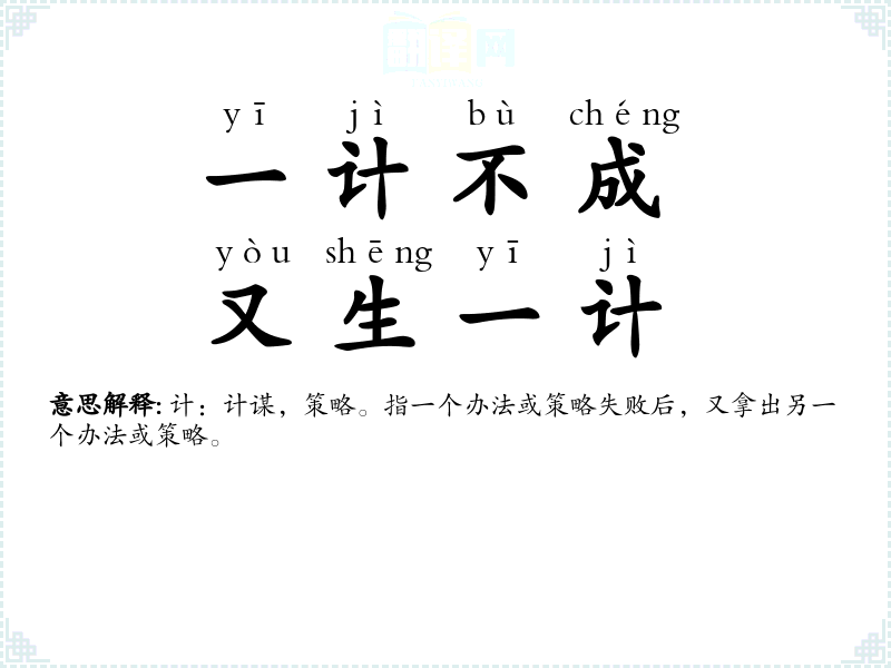 计:计谋,策略。指一个办法或策略失败后,又拿出另一个办法或策略。 |