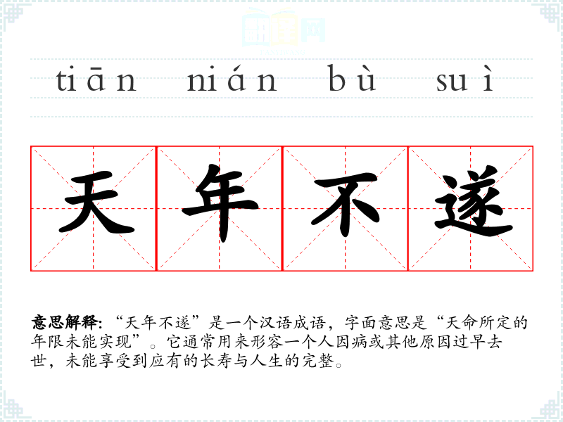 “天年不遂”是一个汉语成语,字面意思是“天命所定的年限未能实现”。它通常用来形容一个人因病或其他原因过早去世,未能享受到应有的长寿与人生的完整。