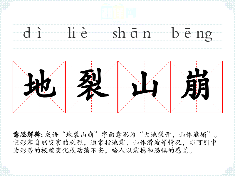 “地裂山崩”出自古代文学作品,最早见于《左传》一书。在古代文献中,常用以描述重大灾难、动乱和社会变革的情境,体现了古人对自然力量的敬畏及对社会动荡的深刻感受。成语中的“地裂”和“山崩”分别代表着地面和山体的剧烈变动,强调了灾难的突然性和不可避免性。