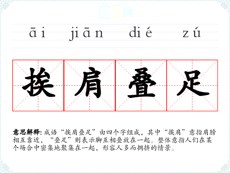 成语“挨肩叠足”由四个字组成,其中“挨肩”意指肩膀相互靠近,“叠足”则表示脚互相叠放在一起。整体意指人们在某个场合中密集地聚集在一起,形容人多而拥挤的情景。