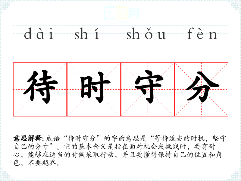 成语“待时守分”的字面意思是“等待适当的时机,坚守自己的分寸”。它的基本含义是指在面对机会或挑战时,要有耐心,能够在适当的时候采取行动,并且要懂得保持自己的位置和角色,不要越界。